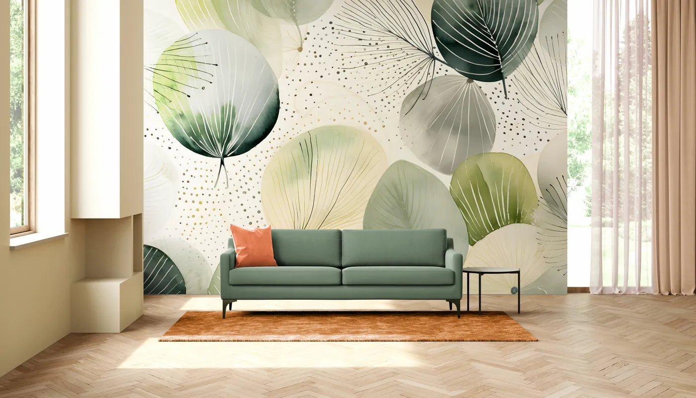 Transformez votre espace avec notre papier peint abstrait feuilles de palmier, un chef-d'œuvre qui allie élégance et sérénité. Ce motif délicat de feuilles stylisées aux formes organiques, dans une palette harmonieuse de verts doux et de gris, s'intègre parfaitement à un fond crème ponctué de points discrets. Inspirée par l'esthétique japonaise, cette création évoque une ambiance zen et épurée, idéale pour une chambre à coucher, un café ou un espace de coworking.