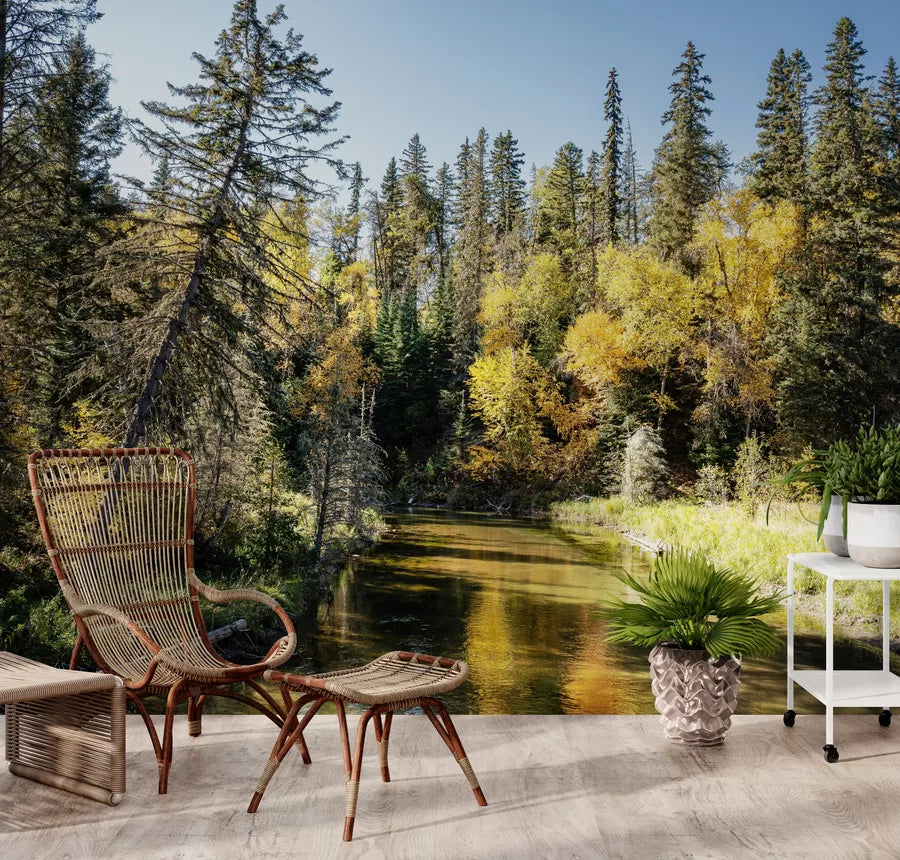 Le papier peint "Arbres aux bords de l'eau" transporte instantanément dans une forêt automnale, où les arbres majestueux aux silhouettes élancées se dressent fièrement, leurs feuillages aux teintes dorées et vertes se reflétant dans les eaux calmes d'une rivière. Ce motif réaliste, inspiré des paysages sauvages de l'Amérique du Nord, crée une ambiance sereine et naturelle, idéale pour apporter une touche de tranquillité à n'importe quelle pièce. Parfait pour une chambre à coucher, ce décor mural évoque la quiétude d'une nature intouchée, invitant à la détente et à la méditation.