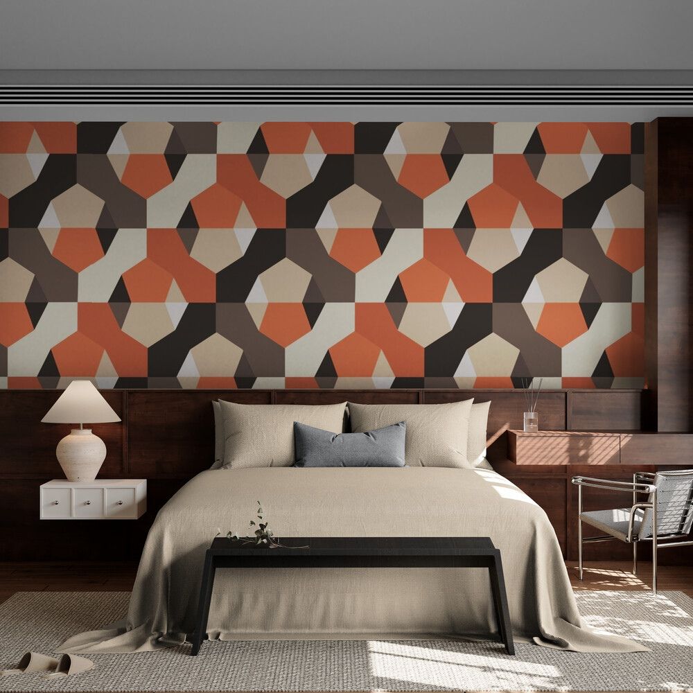 Découvrez le papier peint art et déco terracotta, un véritable chef-d'œuvre de design mural qui transforme instantanément votre espace en une oasis de chaleur et de sophistication. Ce papier peint à motifs géométriques abstraits, composé de pentagones et de formes angulaires, évoque l'élégance rétro des années 70 tout en apportant une touche de modernité. Les tons chauds de rouille, beige, marron et noir créent une ambiance enveloppante, idéale pour une chambre à coucher ou un café cosy.