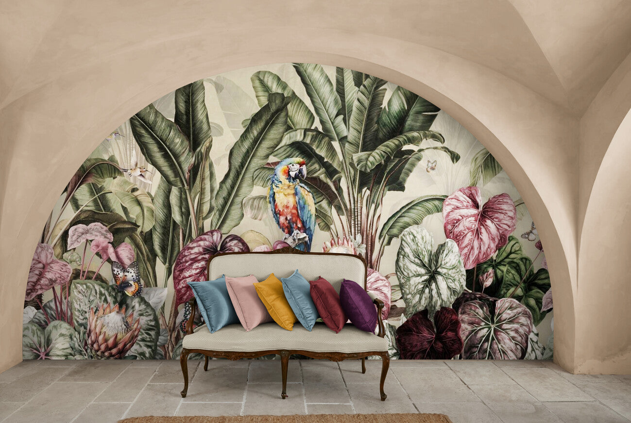 Plongez dans l'exotisme avec notre papier peint bananiers vintage, un motif luxuriant qui transforme votre espace en une jungle tropicale. Ce décor mural, inspiré par l'art botanique, présente de grandes feuilles vertes et roses, des fleurs exotiques et des perroquets colorés, créant une atmosphère réaliste et vibrante. Idéal pour les chambres à coucher, les cafés ou les espaces de coworking, ce papier peint apporte une touche de nature et d'élégance.