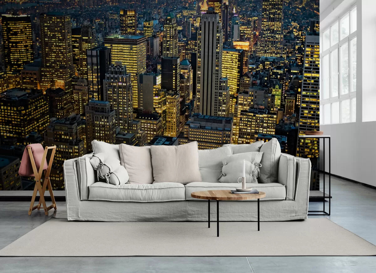 Plongez dans la magie urbaine avec notre papier peint buildings illuminés, un hommage vibrant à la splendeur nocturne de New York. Ce motif saisissant capture l'essence des gratte-ciels illuminés, baignés de tons chauds et dorés, évoquant une ambiance urbaine sophistiquée et moderne. Inspiré par le style Art Déco américain, ce décor géométrique et architectural apporte une touche d'élégance intemporelle à votre espace.