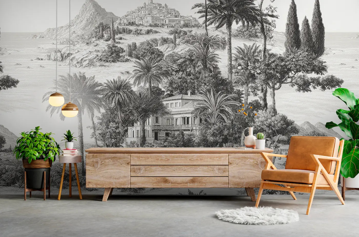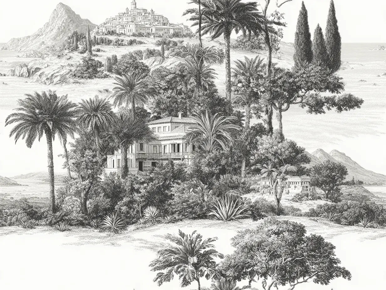 Ce papier peint panoramique cyprès révèle un paysage méditerranéen d'une beauté saisissante, où les silhouettes élancées des cyprès se dressent comme des sentinelles végétales dans un décor gravé d'éternité. Les pins et cyprès dessinent leurs ramures majestueuses au-dessus d'une végétation luxuriante où palmiers, agaves et essences exotiques composent une symphonie botanique d'un raffinement absolu. Cette fresque panoramique transforme instantanément votre espace en un refuge poétique baigné de lumière dorée, évoquant les jardins suspendus de la Riviera italienne et les terrasses ombragées des villas toscanes. L'art de la gravure ancienne sublime chaque détail végétal, créant un relief saisissant qui dialogue avec la lumière naturelle pour offrir une profondeur visuelle extraordinaire.