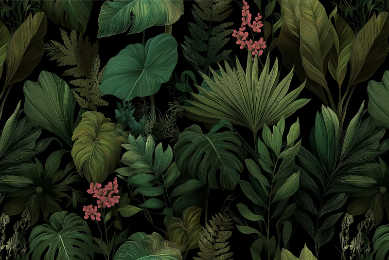 Ce papier peint dark jungle plonge votre intérieur dans les profondeurs ténébreuses d'une forêt primitive, où la végétation luxuriante se déploie dans un camaïeu de verts sombres et d'ombres veloutées. Chaque motif révèle l'âme mystérieuse de la jungle nocturne, capturant l'essence sauvage des feuillages qui s'entrelacent dans une danse silencieuse sous la canopée impénétrable. Cette création dark jungle évoque l'univers gothique de la nature indomptée, où les lianes serpentines et les palmes gigantesques dessinent une cathédrale végétale aux accents dramatiques.