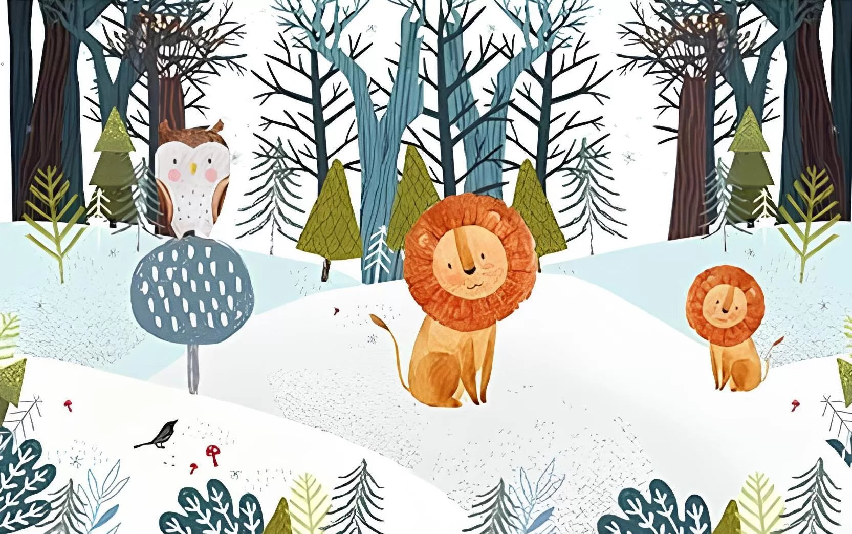 Découvrez le "Papier peint enfant lions et hibou", un motif enchanteur qui transforme instantanément une chambre d'enfant en un havre de paix et de magie. Ce décor mural, inspiré du style scandinave, présente une scène forestière hivernale où des lions majestueux et des hiboux sages se côtoient dans une ambiance douce et poétique. Les tons pastel et les formes stylisées créent une atmosphère chaleureuse et apaisante, idéale pour stimuler l'imagination des plus jeunes.
