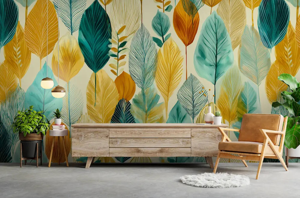 Ce papier peint intissé dévoile une forêt stylisée de feuilles élancées, déclinées dans des nuances chaudes d’ocre et de gaufrés verts profonds, associées à des traits fins évoquant le mouvement naturel du feuillage.