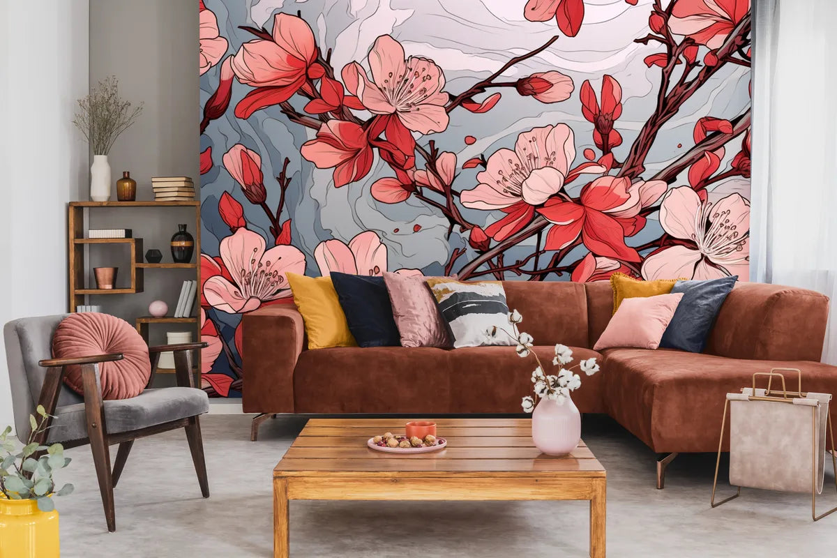 Immergez-vous dans l'élégance intemporelle d'un papier peint japonais fleurs de cerisiers, un motif floral qui transcende les époques. Ce décor mural évoque les jardins japonais en pleine floraison, avec des fleurs de cerisier stylisées dans des tons de rose et de rouge, délicatement posées sur un fond nuageux. Les lignes épurées et les couleurs contrastées créent un style graphique et moderne, parfait pour apporter une touche de sérénité et de sophistication à votre espace.