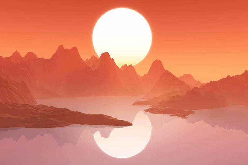 Transformez votre espace avec notre "Papier peint lever de soleil et montagnes", un motif panoramique qui transporte vos murs dans un paysage onirique, parfait pour créer une ambiance sereine et contemplative. Inspiré par l'art numérique, ce papier peint représente des montagnes aux formes douces et un soleil éclatant, baignant la scène dans des tons chauds orangés et rosés. L'ambiance paisible est renforcée par le reflet du soleil et des montagnes dans l'eau, ajoutant une touche mystique à votre intérieur.