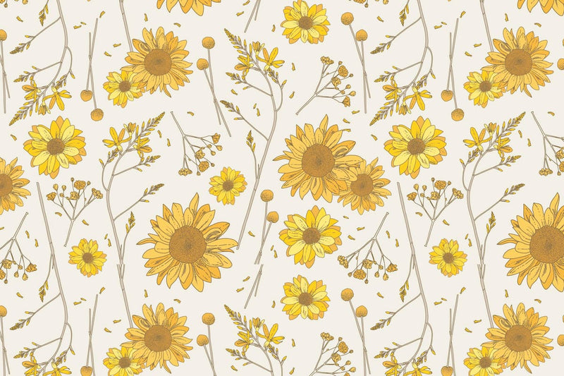 Le papier peint marguerites jaunes vintage, par son motif floral délicat de tournesols et autres fleurs jaunes, invite une ambiance chaleureuse et nostalgique. Ce design vintage, inspiré par la nature et le style bohème, se distingue par ses teintes crème et ses motifs fleuris, créant une atmosphère ensoleillée et champêtre. Idéal pour une chambre à coucher, ce papier peint floral apporte une touche de sérénité et de douceur, parfait pour un espace de détente.