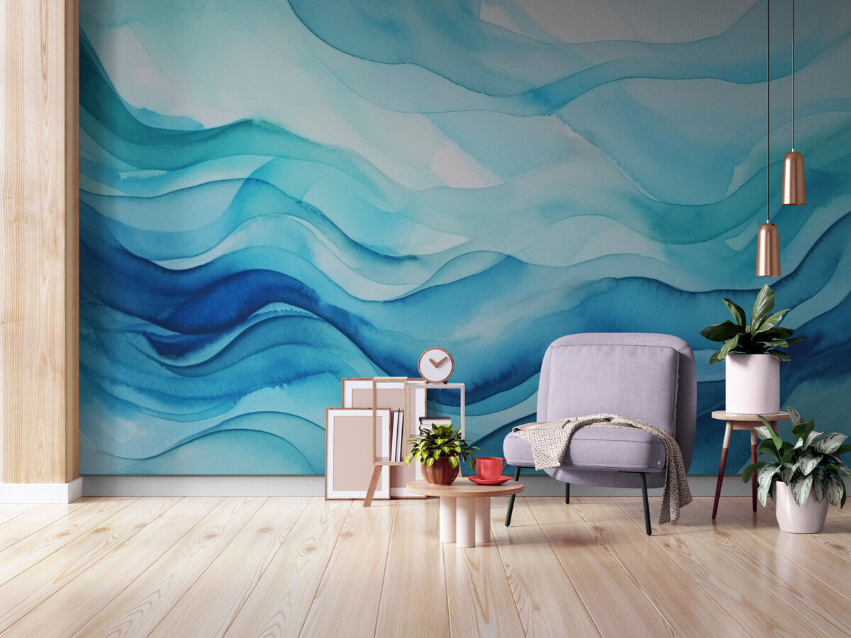 Plongez dans l'apaisante atmosphère marine avec notre papier peint mer abstraite, un chef-d'œuvre d'aquarelle qui transforme votre espace en un havre de paix. Ce motif, évoquant des vagues marines dans des teintes de bleu et de turquoise, apporte une touche de sérénité et de fluidité à votre intérieur. Inspiré par l'esthétique japonaise, il crée une ambiance minimaliste et harmonieuse, idéale pour une chambre à coucher ou un espace de travail comme un coworking.