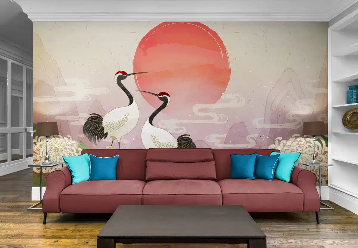 Les formes douces et les couleurs pastel créent une ambiance paisible, idéale pour une chambre à coucher ou un salon. Ce papier peint, avec ses motifs inspirés de la nature et de la culture japonaise, apporte une touche d'exotisme et de tranquillité à votre intérieur. Pour sublimer cet univers, optez pour des meubles en bois clair et des éléments décoratifs en céramique, évoquant la simplicité et l'élégance des intérieurs japonais. Parfait pour un café zen ou un espace de coworking, ce papier peint "Montagnes et Grues Japonaises" transforme votre pièce en un sanctuaire de calme et de beauté, propice à la détente et à la réflexion.