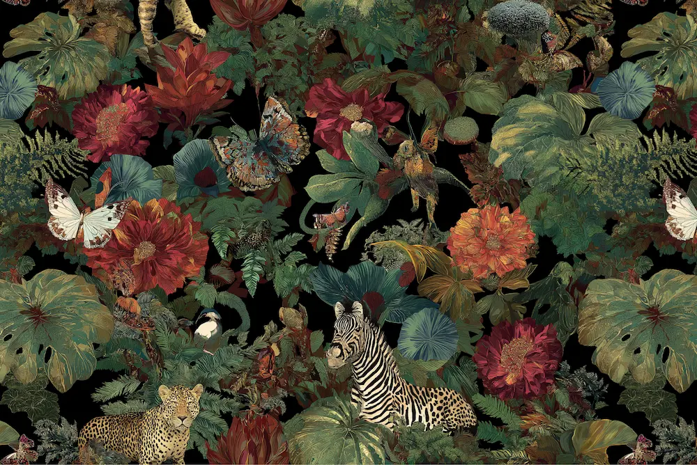 Ce papier peint luxueux déploie une luxuriance tropicale sous un ciel de velours noir, où se mêlent feuilles exubérantes, fleurs profondes et animaux sauvages minutieusement illustrés. Les papillons délicats, perroquets colorés, zèbres et léopards se détachent dans un contraste saisissant, créant une scène immersive digne d’un cabinet de curiosités artistique. Idéal pour sublimer un mur de salon, une salle à manger ou un espace de réception, ce décor mural invite au voyage et à l’évasion tout en apportant une touche sophistiquée et théâtrale. À associer à des meubles en acajou, des accents dorés et un éclairage tamisé pour révéler toute sa profondeur et son caractère envoûtant.