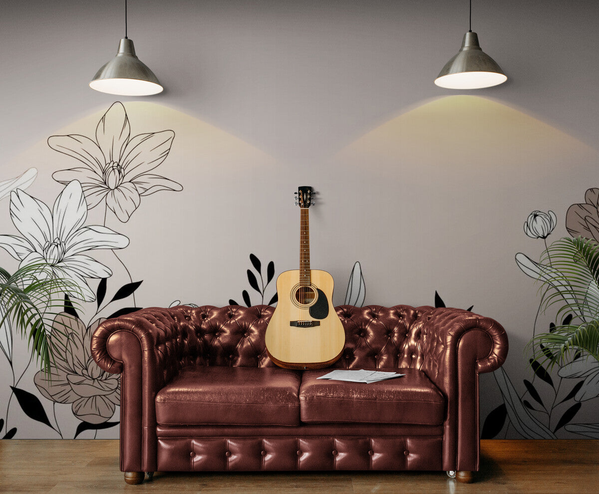 Plongez dans l'univers apaisant du papier peint noir et blanc floral, une création raffinée qui marie élégance et simplicité. Ce décor mural, aux accents scandinaves, se distingue par ses motifs floraux minimalistes, dessinés au trait noir sur un fond beige rosé, évoquant une douce lumière du matin filtrant à travers les feuilles. Les fleurs et les feuilles, délicatement tracées, apportent une touche de nature et de sérénité, transformant votre espace en un havre de paix. Idéal pour une chambre à coucher, ce papier peint floral minimaliste créera une ambiance zen et propice à la détente, invitant au repos et à la méditation.