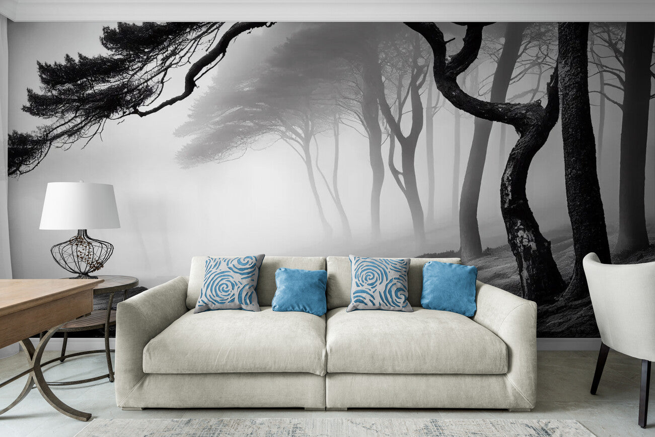Ce papier peint, avec ses teintes monochromes, apporte une touche d'élégance intemporelle, tout en apportant une sensation de profondeur et de calme. Pour compléter cet univers, optez pour des meubles en bois clair et des éléments de décoration minimalistes, afin de ne pas surcharger l'espace. Ajoutez des luminaires doux pour accentuer l'effet brumeux et créer une ambiance chaleureuse. Que ce soit pour un commerce, un café ou une salle de réunion, ce papier peint noir et blanc forêt brumeuse transforme n'importe quel espace en un havre de paix, où l'esprit peut se libérer et se ressourcer.