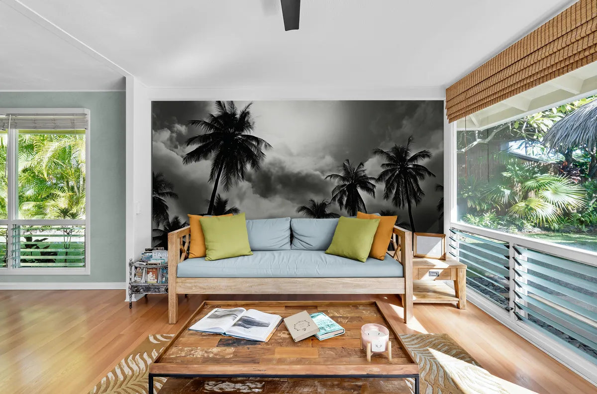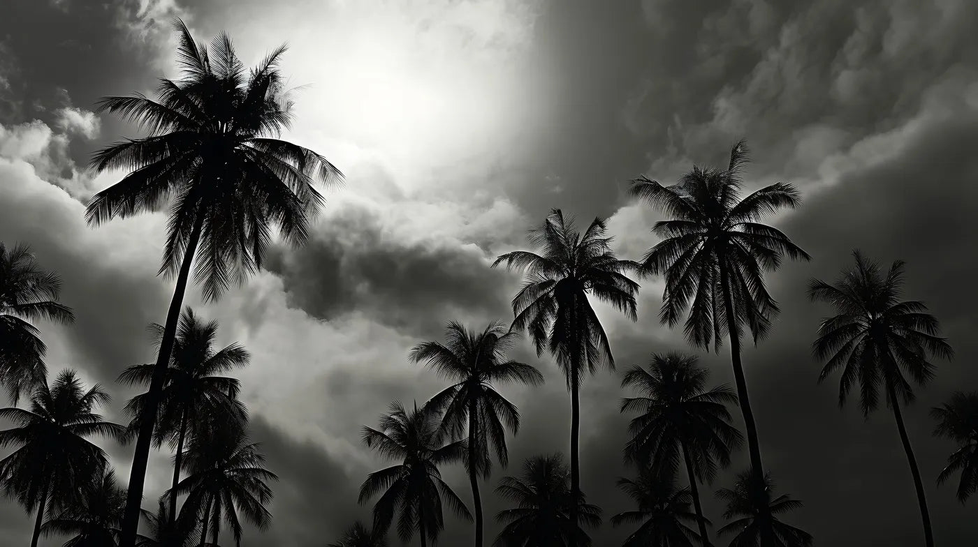 Papier peint noir et blanc palmiers et nuages
