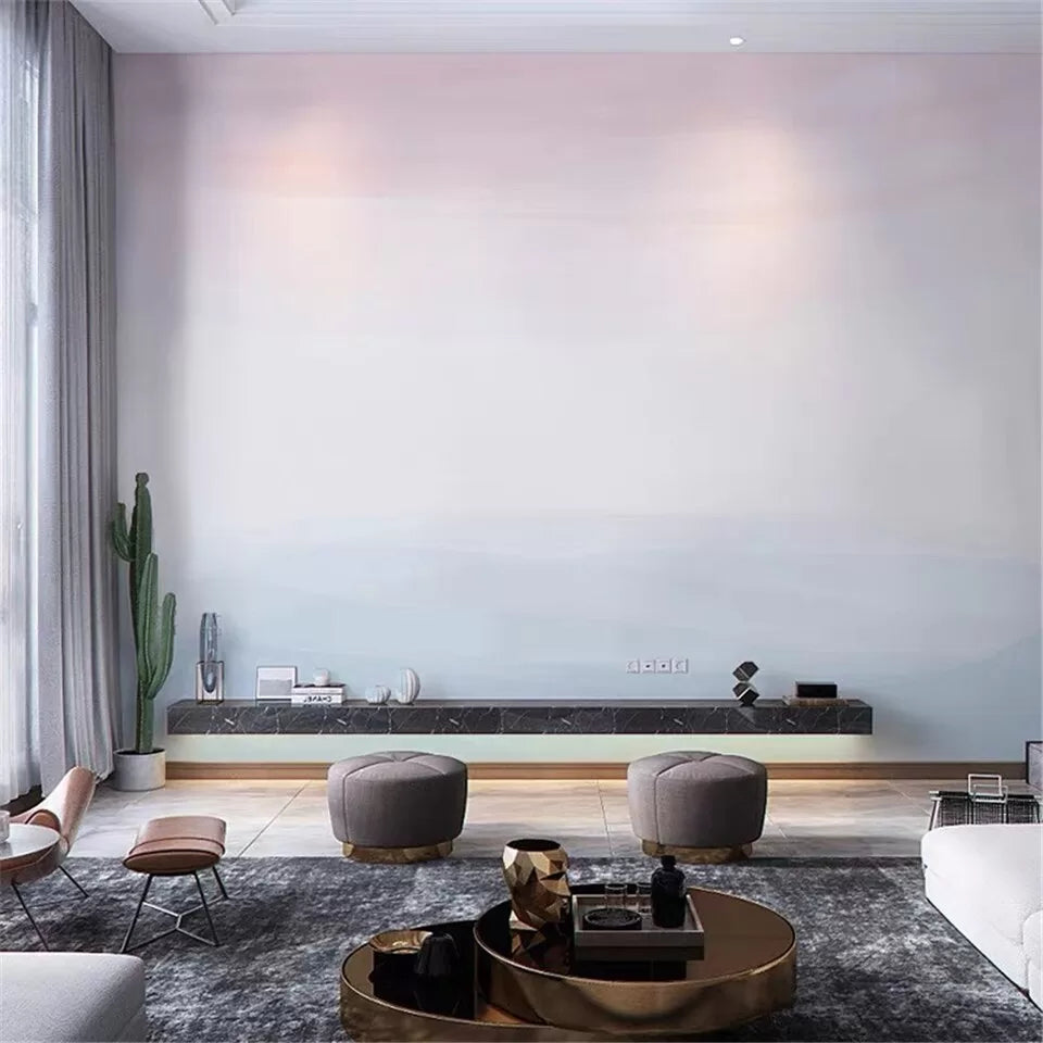 Plongez dans l'harmonie subtile d'un motif abstrait, où des montagnes douces et apaisantes se dessinent en dégradés de rose pâle et de bleu clair, évoquant un paysage nordique serein. Ce papier peint, inspiré par l'aquarelle et le minimalisme japonais, transforme votre espace en un sanctuaire de tranquillité. Idéal pour une chambre à coucher, il crée une ambiance paisible, propice au repos et à la méditation.