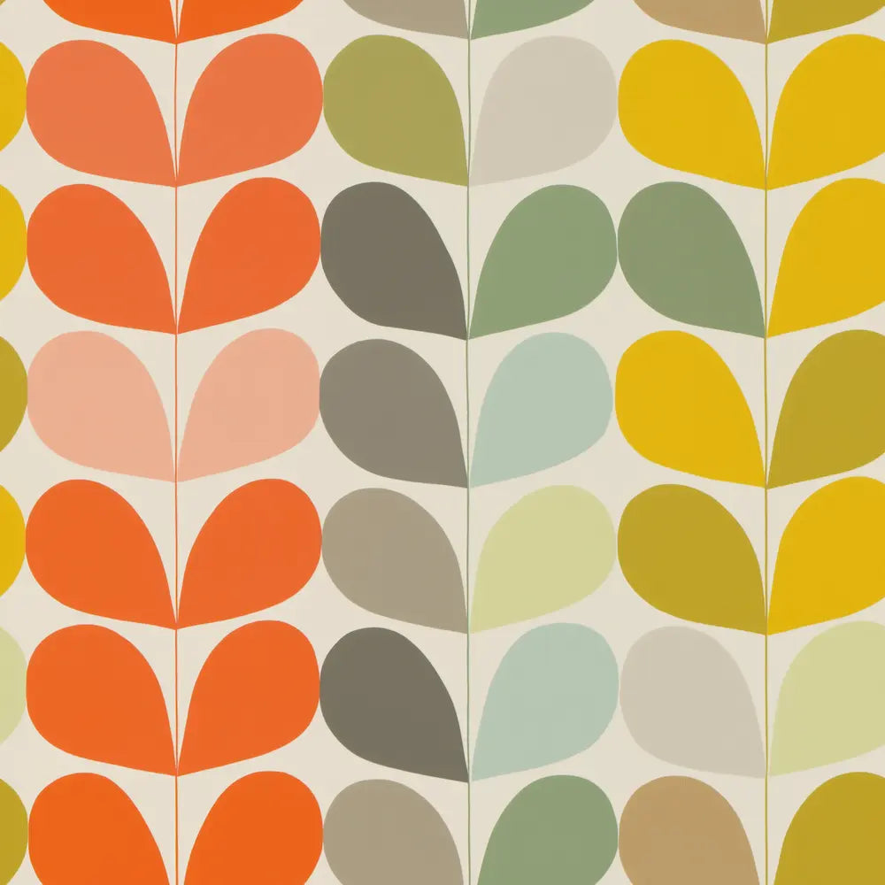 Ce papier peint intissé dévoile un motif iconique de feuilles stylisées disposées en rangées régulières, dans une palette riche d'orange corail, de verts mousse et de jaunes moutarde sur fond crème. Son design géométrique s'inspire de l'esthétique rétro des années 60-70, apportant une touche vintage chic et colorée à votre intérieur. Parfait pour égayer un salon, une cuisine ou un bureau, ce décor mural crée une ambiance joyeuse et dynamique. Il s'harmonise idéalement avec des meubles en bois clair, des accessoires en céramique colorée et des textiles unis pour composer un décor éclectique et plein de caractère.