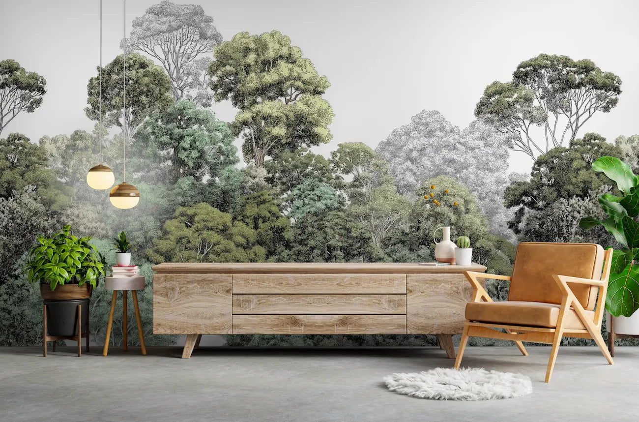 En architecture d'intérieur, ce papier peint panoramique forestier Bellewood sublime particulièrement les espaces de vie contemporains et les bureaux, apportant une dimension biophilique remarquable à votre pièce. Dans un salon moderne, associez-le à un mobilier en chêne naturel et des textiles lin écru pour créer un dialogue harmonieux avec la palette végétale du motif, complété par des luminaires en métal noir mat aux formes organiques. Pour un espace coworking ou une salle de réunion, cette décoration murale nature Bellewood favorise la concentration et la créativité tout en réduisant le stress, sublimée par des sièges en cuir cognac et des accessoires en terre cuite. L'effet panoramique de ce papier peint forêt stylisée agrandit visuellement l'espace tout en créant une bulle de sérénité végétale, transformant votre mur en fenêtre ouverte sur une forêt apaisante où la nature et l'art décoratif contemporain se conjuguent en parfaite harmonie biophilique.