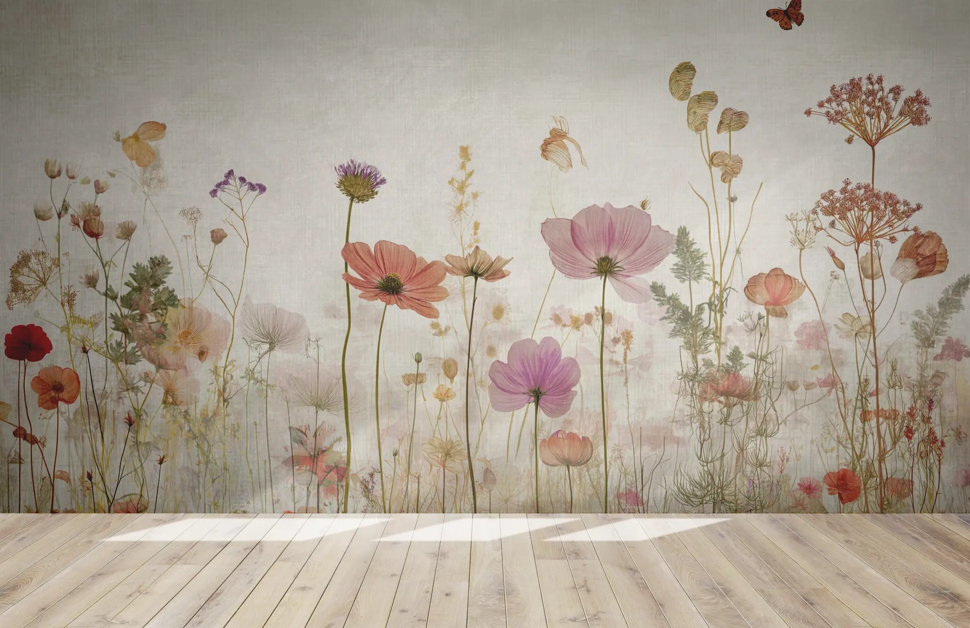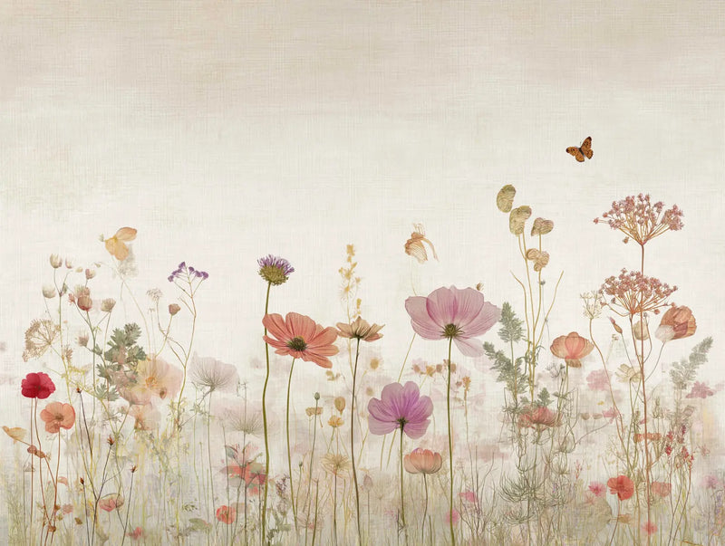 Dans ce papier peint panoramique bucolique, la nature s'invite chez vous avec une délicatesse infinie. Les cosmos et pavots, peints dans des teintes douces de rose, d'orange et de rouge pâle, dansent sur un fond beige texturé rappelant la toile de lin. Les tiges élancées, d'un vert tendre, s'entrelacent gracieusement tandis que deux papillons virevoltent avec légèreté, apportant une touche de vie à cette composition botanique. La technique artistique, évoquant le pressage de fleurs, confère à l'ensemble une transparence vaporeuse qui sublime l'aspect poétique de ce décor mural. Cette fresque murale transformera votre intérieur en un havre de paix champêtre, idéal pour une chambre parentale ou un espace de réception lumineux. L'aspect éthéré des motifs floraux crée une atmosphère apaisante qui invite à la contemplation et au bien-être. Pour sublimer ce papier peint, privilégiez un mobilier aux lignes épurées en bois clair ou en rotin, accompagné de textiles naturels comme le lin ou le coton. Cette composition botanique s'harmonisera particulièrement bien avec des accessoires en céramique mate et des luminaires en fibres naturelles, créant ainsi un cocon raffiné où la nature devient art. Parfait pour les amoureux d'une décoration douce et intemporelle qui cherchent à insuffler une âme bucolique à leur espace de vie.