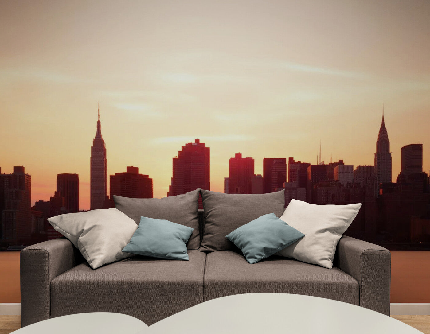 Transformez votre espace avec le papier peint panoramique "Coucher de soleil sur les buildings", une œuvre d'art qui transcende les murs pour offrir une expérience visuelle immersive. Ce motif captivant met en scène la silhouette emblématique de New York City au crépuscule, où les gratte-ciels majestueux se drapent de teintes orangées et rosées, créant une ambiance chaleureuse et sophistiquée. Inspiré par l'esthétique urbaine américaine, ce design photographique apporte une touche de modernité et de dynamisme à votre intérieur.