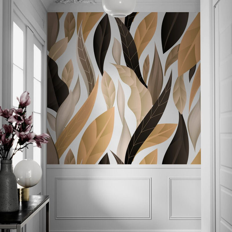 Découvrez le papier peint panoramique couloir, une véritable oasis de sérénité pour vos espaces intérieurs. Ce papier peint, orné de feuilles stylisées aux formes élancées et aux teintes chaudes, du beige clair au brun foncé, s'harmonise parfaitement avec un fond blanc immaculé. Inspiré par la nature et subtilement teinté d'art déco, ce design crée une atmosphère élégante et apaisante, idéale pour sublimer votre intérieur. Imaginez-vous dans un couloir qui semble s'étendre à l'infini, où chaque pas vous transporte dans une jungle urbaine, un mélange de verdure et de modernité.
