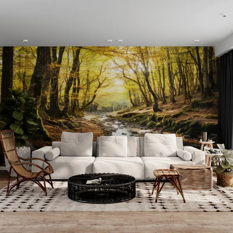 Pour compléter cet univers naturel, optez pour des meubles en bois clair et des textiles douillets, comme des coussins et des plaids en laine, qui renforceront l'atmosphère chaleureuse et accueillante. Les nuances automnales du motif se marient parfaitement avec des accessoires décoratifs en terre cuite ou en métal oxydé, ajoutant une touche d'authenticité et de charme rustique. Dans un café ou un coworking, ce papier peint panoramique forêt et cours d'eau invite à la contemplation et à la créativité, créant un environnement inspirant pour les clients et les collaborateurs. Pour une salle de réunion, il apporte une touche de nature, favorisant la concentration et la réflexion. Ainsi, ce papier peint panoramique forêt et cours d'eau est bien plus qu'un simple décor mural ; il est une véritable invitation à la tranquillité et à l'évasion, transformant chaque pièce en un havre de paix où la nature et l'élégance se rencontrent.