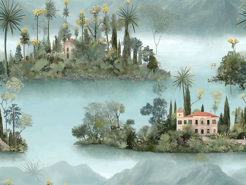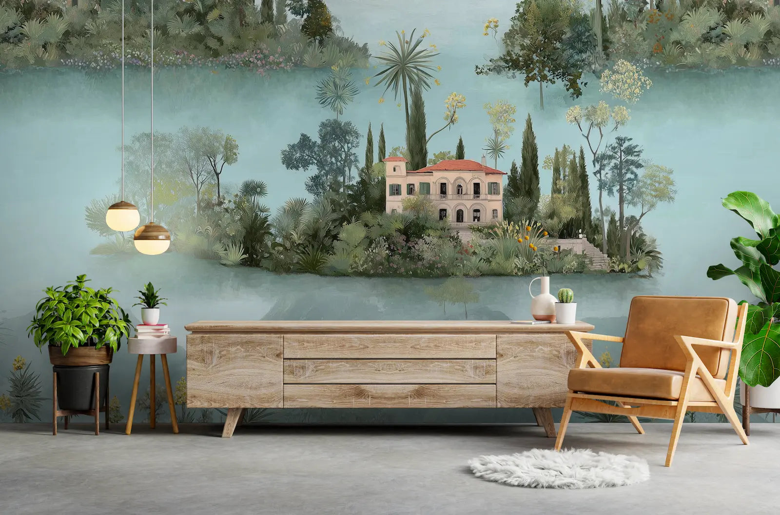 Ce papier peint panoramique italien révèle un paysage méditerranéen d'une poésie saisissante, où une villa rosée se niche au cœur d'une végétation luxuriante aux tonalités jade et émeraude. Les cyprès élancés, les palmiers majestueux et la floraison délicate des arbustes composent une fresque végétale d'inspiration toscane, baignée dans une lumière douce et vaporeuse. Cette fresque murale panoramique transforme instantanément votre espace en sanctuaire méditerranéen, évoquant les jardins secrets des villas italiennes où le temps semble suspendu. L'harmonie chromatique entre les verts nuancés de la végétation et les tons poudrés de l'architecture crée une ambiance sereine et raffinée, idéale pour un salon contemporain ou une chambre parentale en quête d'élégance intemporelle. En architecture d'intérieur, ce papier peint italien panoramique s'épanouit particulièrement dans les espaces de détente et de réception, apportant une profondeur visuelle remarquable à votre pièce. Pour un salon, associez-le à un mobilier en bois naturel et des textiles lin dans les tons beiges et ocre, créant un dialogue harmonieux avec la palette végétale du motif. Dans un bureau ou espace coworking, cette décoration murale italienne instaure une atmosphère apaisante propice à la concentration, sublimée par des luminaires en laiton brossé et des plantes vertes qui font écho à la luxuriance du paysage. L'effet panoramique de cette tapisserie décorative agrandit visuellement l'espace tout en créant un point focal captivant, transformant votre mur en fenêtre ouverte sur un Eden méditerranéen où la nature et l'art de vivre italien se conjuguent en parfaite symphonie.