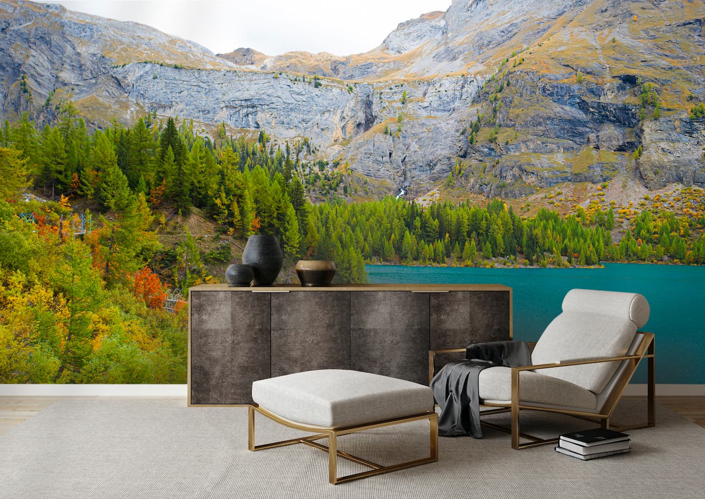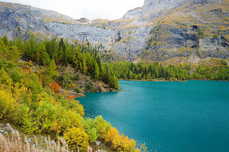 Plongez dans l'harmonie d'un paysage alpin avec notre papier peint panoramique montagne et lac, un chef-d'œuvre qui transforme instantanément vos espaces intérieurs en un sanctuaire de tranquillité. Ce décor mural, inspiré des paysages suisses, offre une vue imprenable sur un lac turquoise bordé de montagnes rocheuses majestueuses et une végétation aux teintes automnales. Le motif, d'une précision photographique réaliste, apporte une touche de nature authentique, idéale pour créer une ambiance sereine et apaisante.