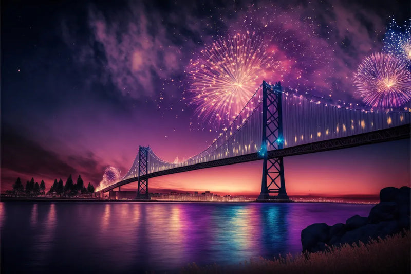 Plongez dans l'authentique magie urbaine avec notre papier peint panoramique "Pont illuminé" et transformez instantanément votre espace en un havre de célébration et de modernité. Ce motif captivant, idéal pour une chambre ou un café, met en scène une vue nocturne époustouflante du célèbre pont de San Francisco, illuminé de mille feux et accompagné de feux d'artifice éclatants. Les couleurs vibrantes et les formes géométriques du pont, combinées à une ambiance festive, évoquent une atmosphère de fête perpétuelle, parfaite pour insuffler une énergie dynamique et inspirante.