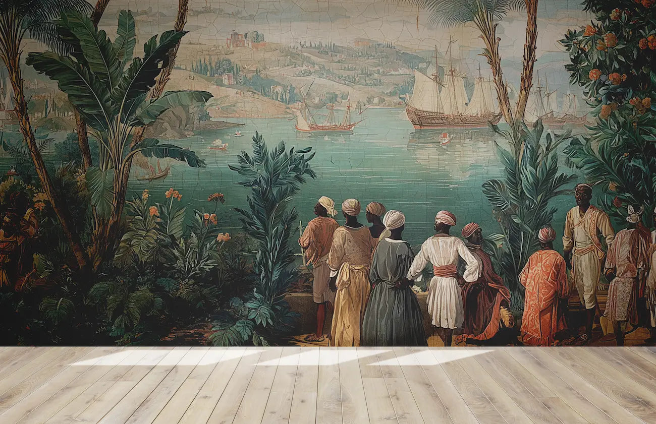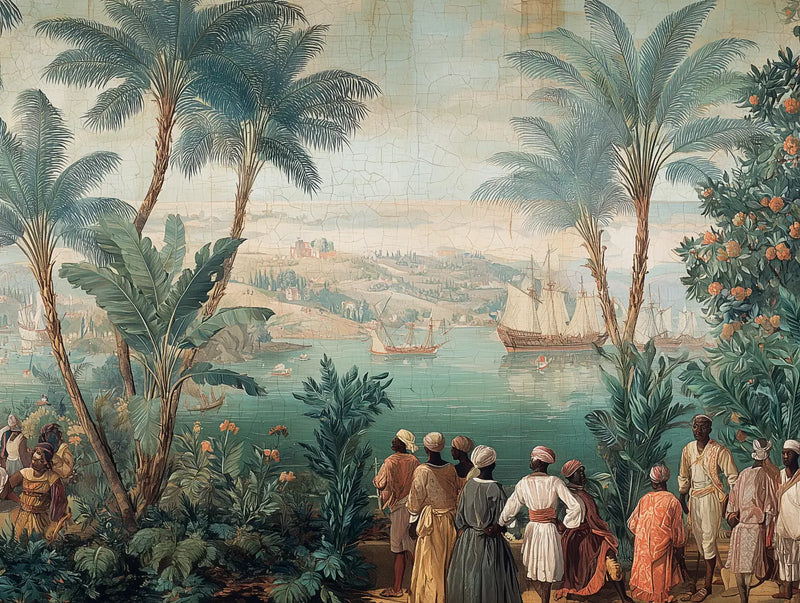 S'inspirant des gravures anciennes du XVIIIe siècle, ce papier peint panoramique nous transporte dans un voyage onirique au cœur d'une colonie portuaire tropicale. La composition magistrale dévoile une scène maritime animée où majestueux voiliers se balancent doucement dans un port bordé d'une végétation luxuriante. Les teintes subtiles de verts profonds, de bleus océaniques et de beiges chaleureux sont rehaussées par des touches d'orange et de rouge qui illuminent les costumes d'époque des personnages. La texture craquelée distinctive évoque le charme des œuvres anciennes, tandis que le traitement minutieux des détails - des larges feuilles de bananiers aux cordages des navires - crée une fresque d'une richesse visuelle exceptionnelle. Ce décor panoramique transformera votre intérieur en une fenêtre ouverte sur un monde d'exploration et d'aventure. Idéal pour insuffler une atmosphère coloniale raffinée dans un salon ou une salle à manger, il s'harmonise parfaitement avec des meubles en bois sombre et des accessoires en rotin. Dans un espace professionnel comme un restaurant ou un hôtel boutique, il créera une ambiance exotique transportant instantanément vos clients dans l'atmosphère des comptoirs coloniaux. Pour sublimer cette fresque, privilégiez un éclairage doux et chaleureux, et accompagnez-la de plantes tropicales pour renforcer l'immersion dans cet univers d'exploration maritime. Les textures naturelles comme le lin ou le velours, dans des tons de vert sauge ou de bleu océan, complèteront harmonieusement ce tableau vivant.