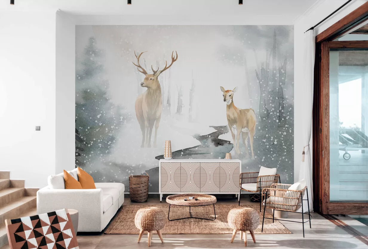 Ce papier peint, avec ses motifs naturels et ses teintes apaisantes, est parfait pour ceux qui recherchent un décor de style nature, propice à la détente et à la méditation. Pour compléter l'ambiance, optez pour des meubles en bois clair et des éclairages doux, afin de renforcer l'harmonie entre l'intérieur et l'extérieur, tout en apportant une touche de modernité et d'élégance à votre espace. Ce papier peint paysage forêt enneigée et cerfs est une véritable invitation à la tranquillité, transformant chaque pièce en un refuge paisible, loin du tumulte du quotidien.