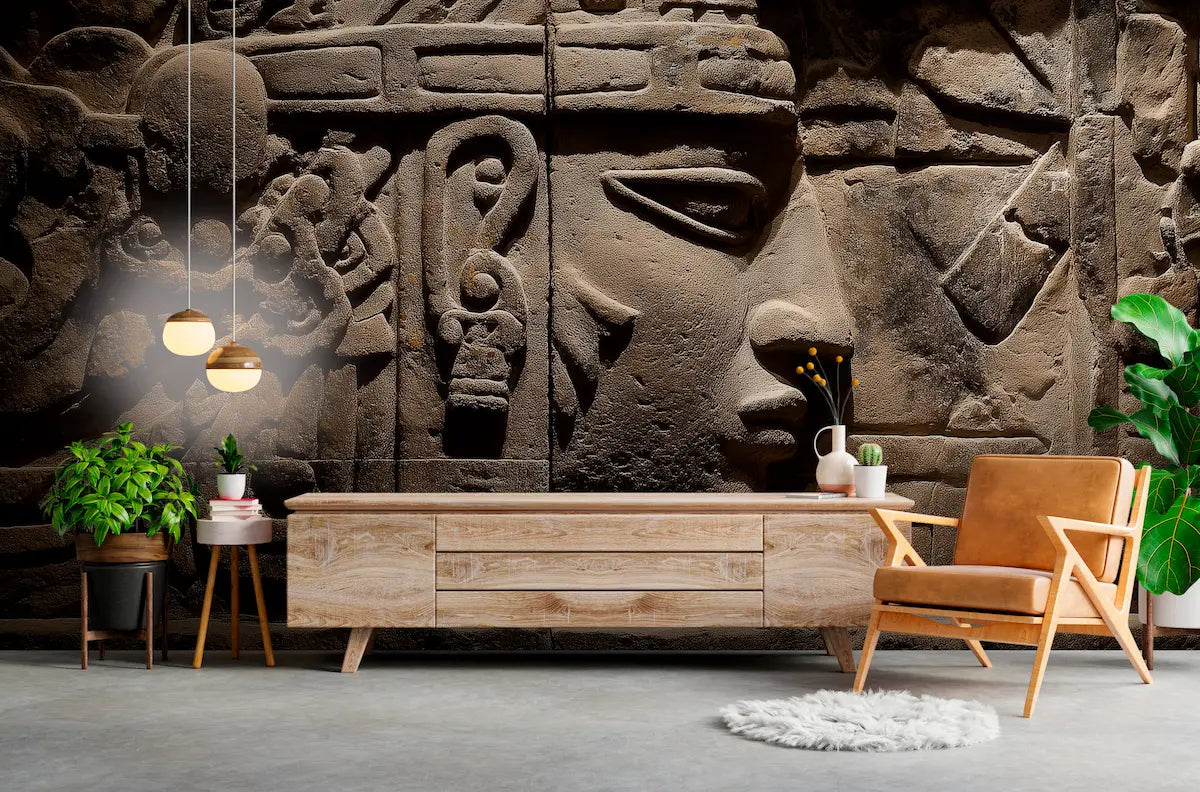 Ce papier peint capture l'essence mystique des civilisations précolombiennes à travers un relief sculpté aux tonalités ocre et terre brûlée, où émergent des visages énigmatiques et des symboles géométriques millénaires. Les motifs gravés dans la pierre évoquent les temples perdus des Andes, créant une fresque murale d'une profondeur saisissante qui transforme instantanément l'espace en sanctuaire contemporain. Cette composition architecturale sublime révèle des détails fascinants : masques rituels, glyphes sacrés et ornementations complexes qui dialoguent dans un langage visuel ancestral, apportant une dimension spirituelle et culturelle remarquable à votre intérieur.