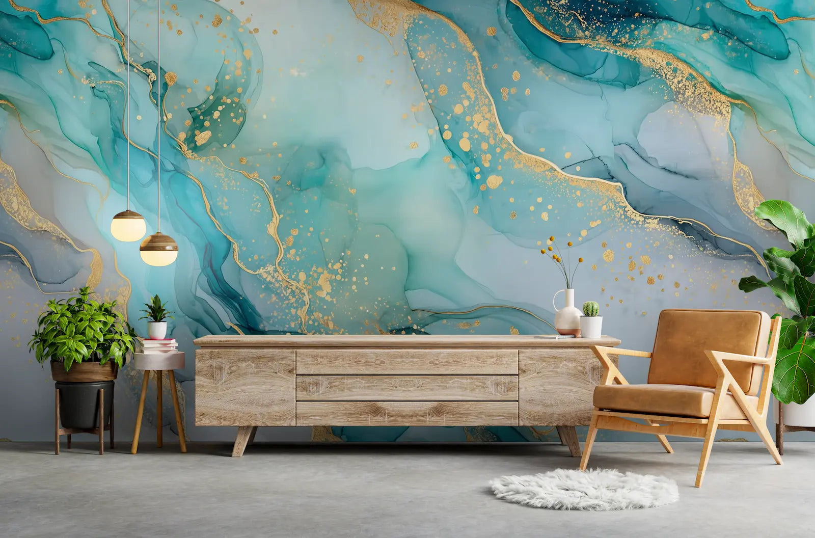 Cette photo papier peint chambre adulte dévoile une œuvre d'art liquide saisissante où l'encre turquoise et les dorures précieuses fusionnent dans un ballet aquatique fascinant, évoquant les profondeurs marines cristallines parcourues de veines d'or pur. Le motif abstrait révèle des nuances de bleus céladon qui ondulent gracieusement à travers des gris nacrés, ponctuées de particules dorées scintillantes qui captent et reflètent la lumière comme autant d'étoiles dispersées. Cette décoration murale artistique transforme votre chambre en galerie contemporaine, où chaque regard découvre de nouvelles profondeurs et textures dans cette composition fluide d'une beauté hypnotique. La richesse chromatique de ce revêtement mural panoramique évoque l'art de l'aquarelle monumentale, insufflant une sérénité luxueuse à votre espace intime.
